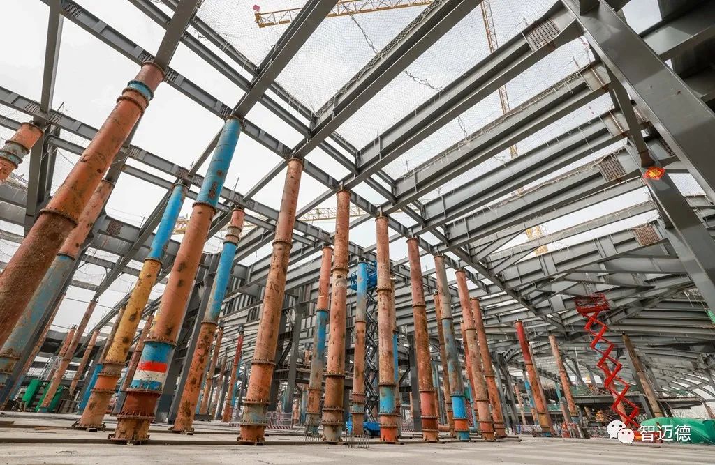 走進施工現場,主報告廳的最大跨度達到47.6米,懸挑21米,極具視覺沖擊力。“由于限高和使用空間要求,我們決定使用多排的單根‘工’字鋼作為屋面鋼結構,減少屋面占用室內空間。”張帥介紹,項目采用鋼筋混凝土組合梁的形式制作了一個特殊的“屋頂”,依靠混凝土的抗壓性來承載未來屋面上的綠化重量,同時借助鋼結構抗拉性強的特點托起混凝土,將屋面整體的重量通過兩側立柱進行分散,打造出堅固的體系。