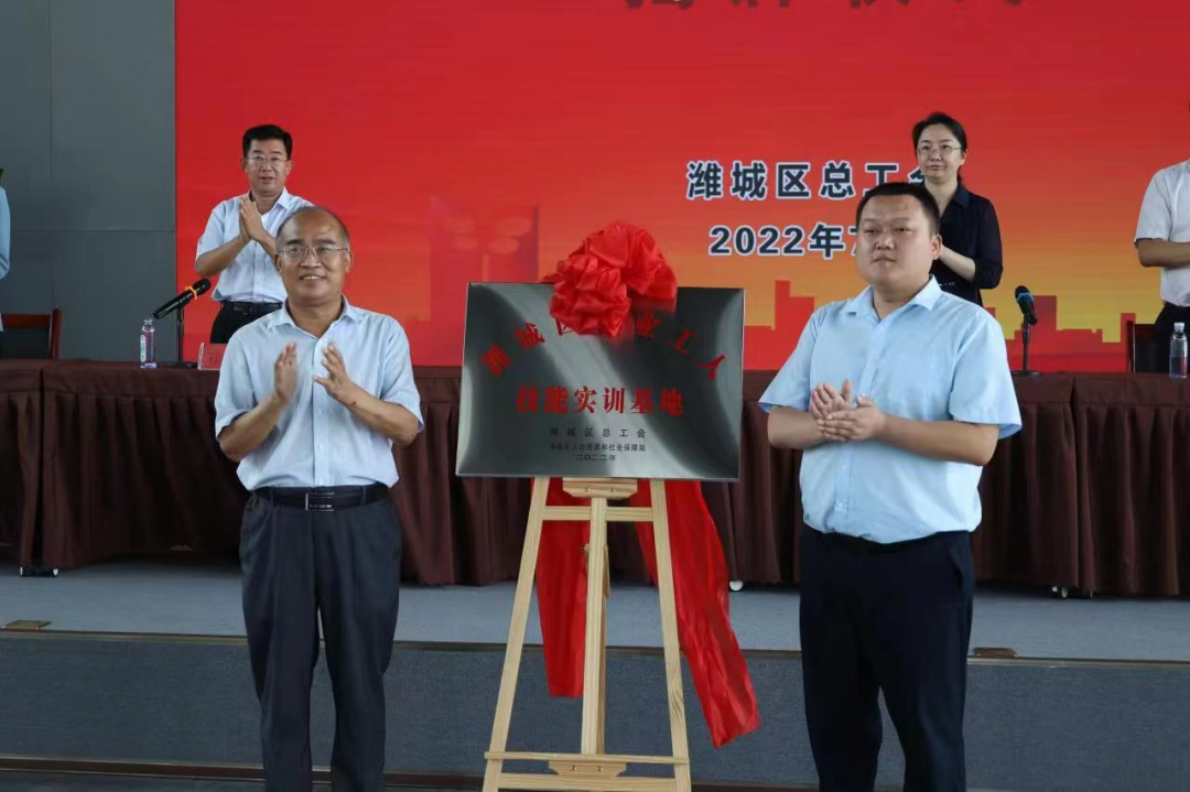 于守君、張兆瑞同志為“濰城區(qū)產(chǎn)業(yè)工人技能實(shí)訓(xùn)基地”揭牌。