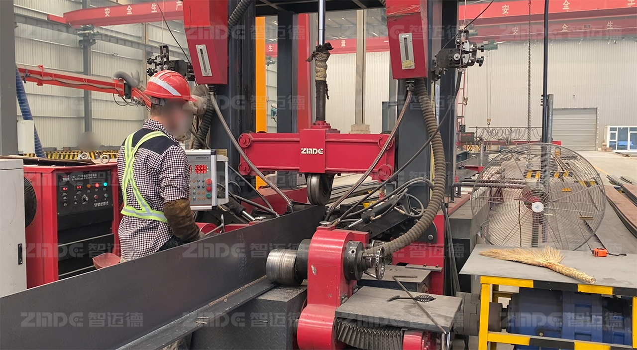 而組焊矯一體機的出現,打破了這一困境。組焊矯一體機創新性地將組立、焊接、矯正三道工序集成在一臺設備上,僅需1~2人即可操作。設備設計精密、高度集成,通過智能化控制系統,提升鋼結構加工的精準控制,并且可自動對中,無需點焊,腹板18mm以下免坡口焊接,采用熱焊熱矯工藝,從頭焊到尾,在提高生產效率的同時,有效提升了鋼構件的產品品質。與此同時,搭配智邁德“烏騅”六極六弧焊機的組焊矯一體機可實現薄板、厚板的焊接,并可選配智邁德“絕影”三極三弧焊機,實現焊接效率的大幅度提升。
